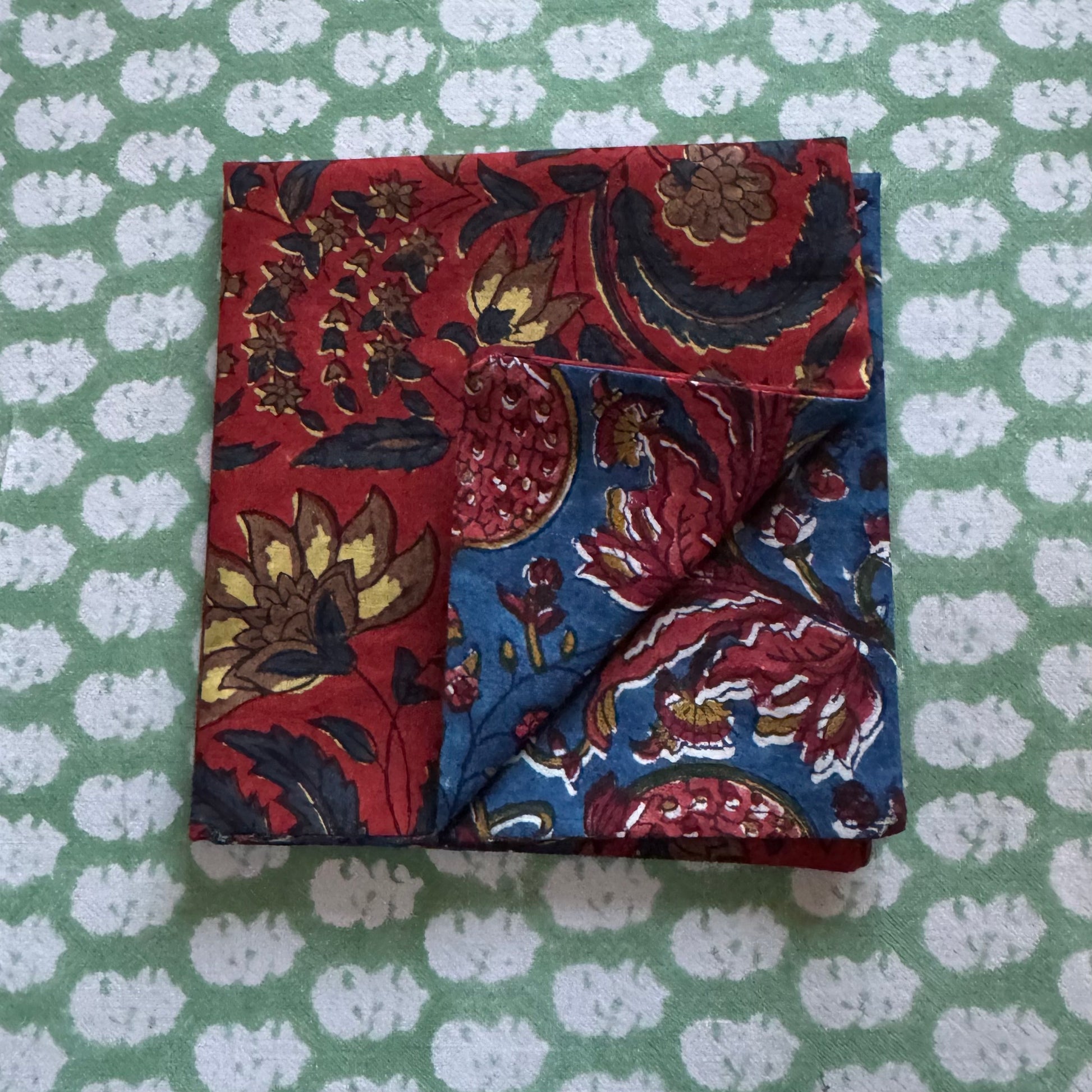 Our hand block printed cotton handkerchiefs are printed in Jaipur and made by us in Scotland.