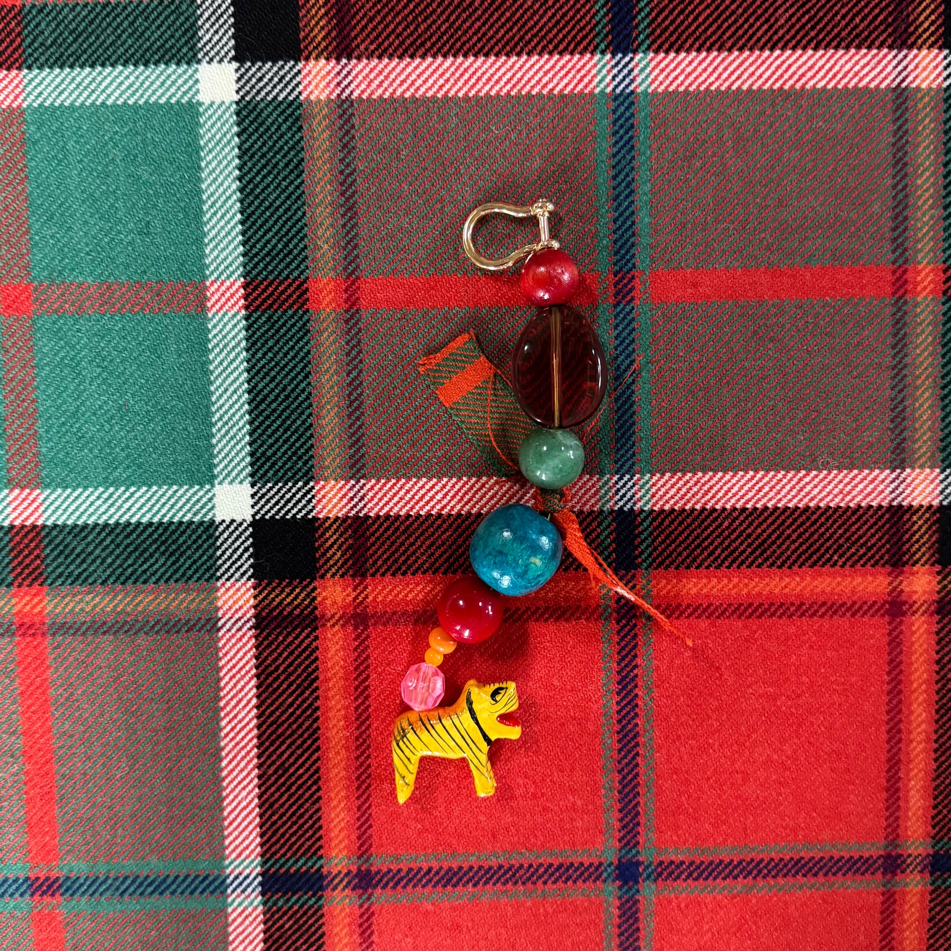 A strong brass shackle allows you to easily attach your charm to anything you wish. It is made from recycled beads, semi precious stones, Indian papier-mache animals and most importantly the remnants of our tartan.