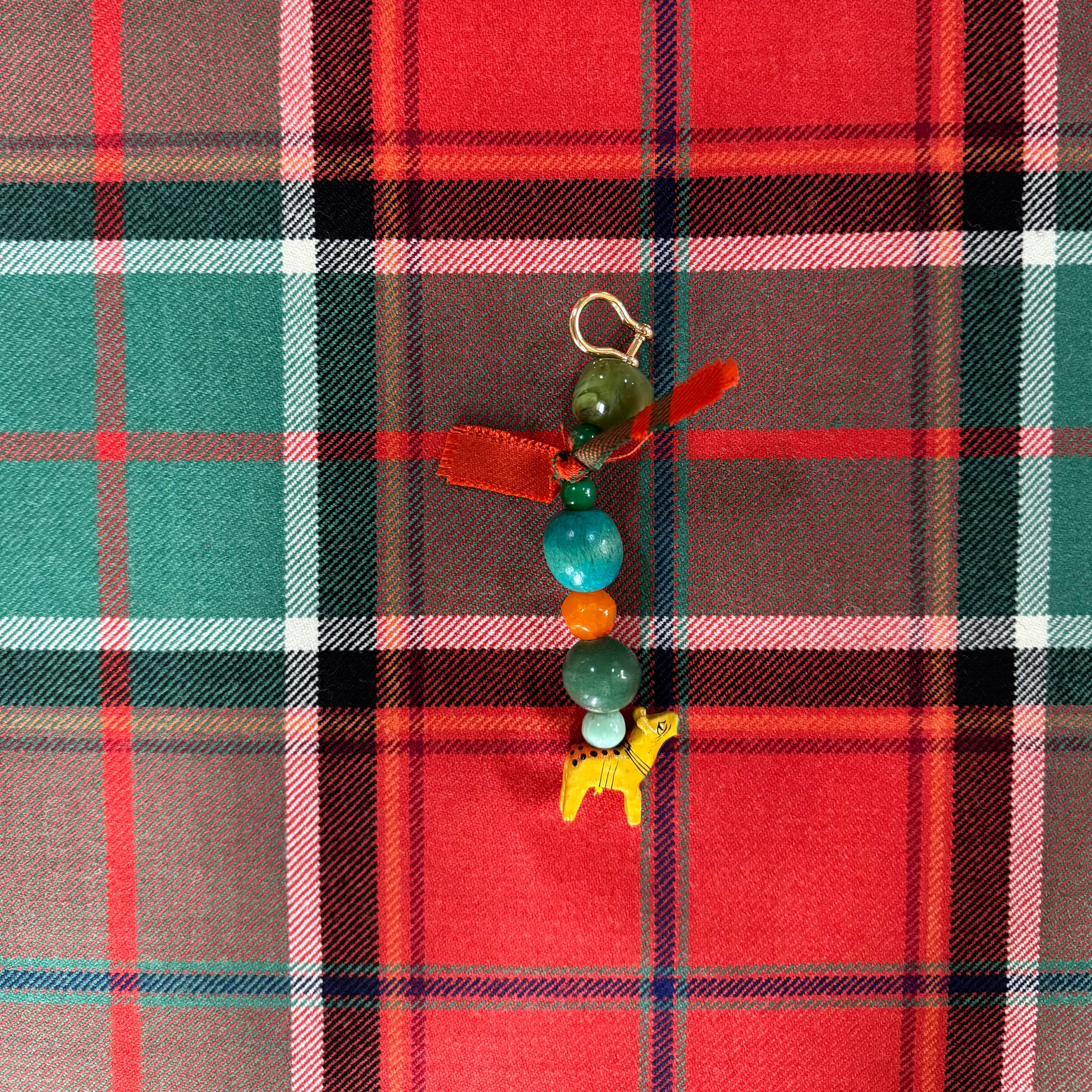 A strong brass shackle allows you to easily attach your charm to anything you wish. It is made from recycled beads, semi precious stones, Indian papier-mache animals and most importantly the remnants of our tartan.